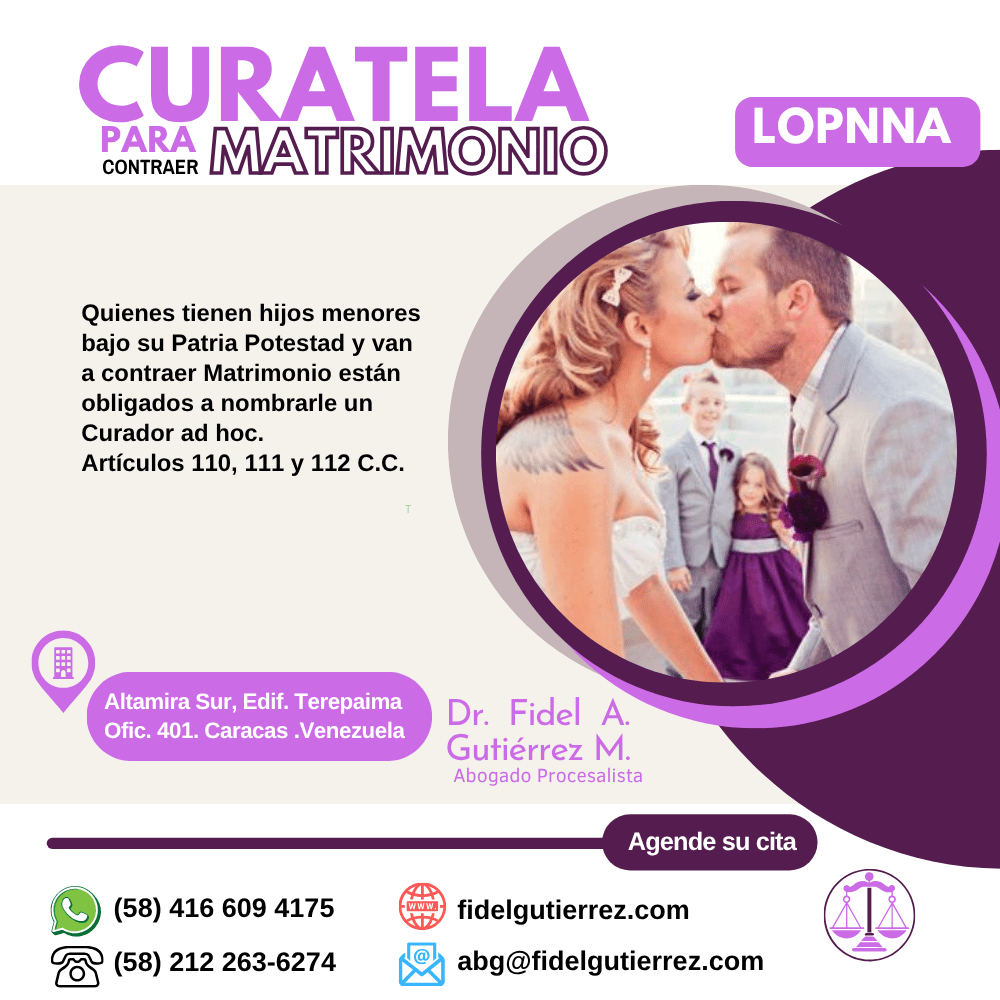 La Curatela o nombramiento de Curador Ad-Hoc, para contraer Matrimonio en Venezuela, según la doctrinaria Sandra Aguilera Brizuela en su obra: “Práctica Forense LOPNNA” p.p. 77, tiene lugar en virtud de la prohibición contenida en los artículos 110 al 112 del Código Civil venezolano. Denominada también impedimento impedientes de Inventario, según el cual la persona que va a contraer matrimonio y tenga niños, niñas o adolescentes bajo su patria potestad, debe acudir al Tribunal de Protección de Niños, Niñas y Adolescentes y solicitar nombramiento de Curador Ad-Hoc, pudiendo proponer en la misma solicitud el optante a dicho cargo.